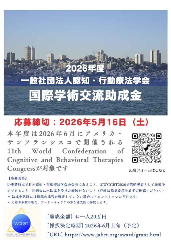 日本認知・行動療法学会では,会員の国際学術交流を支援するため国際学会での発表助成を行っております。 皆様お誘い合わせの上,申請いただきますようお願い申し上げます。