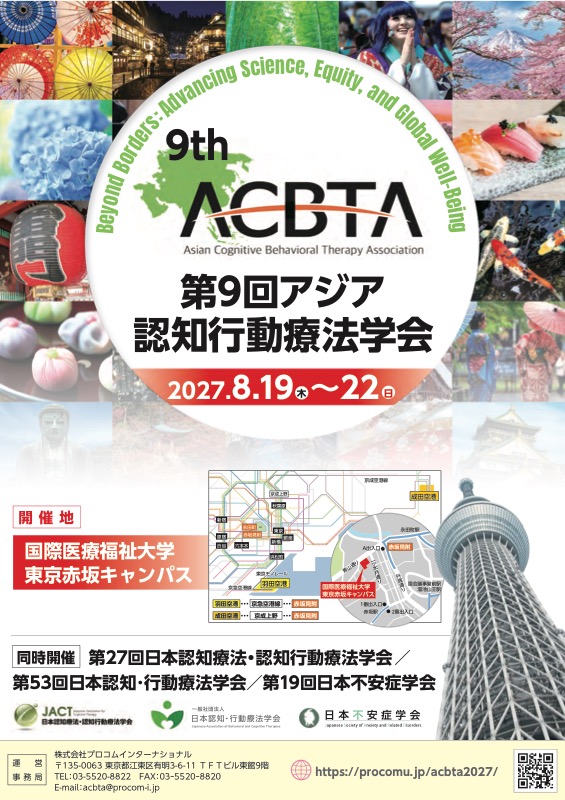 日本認知・行動療法学会(JABCT)は日本認知療法・認知行動療法学会、日本不安症学会とともに、第9回アジア認知行動療法学会を主催します。 2027年8月19日~22日の日程で、場所は東京赤坂の国際医療福祉大学です。国内外4学会に同時に参加できる機会となります。詳細は以下のホームページをご参照ください。